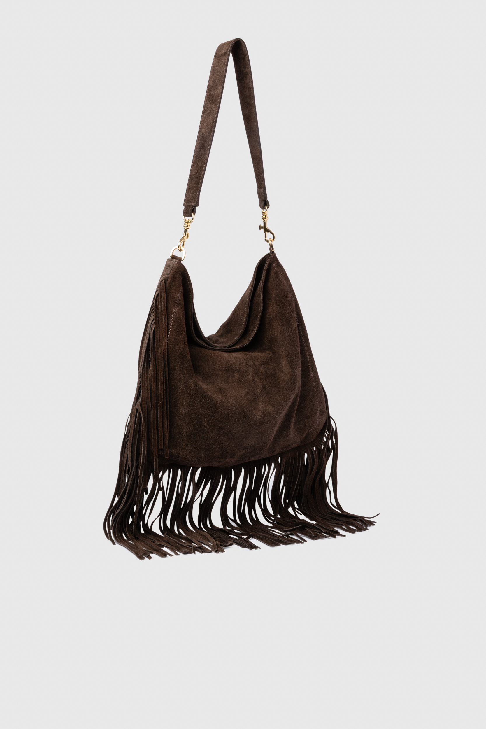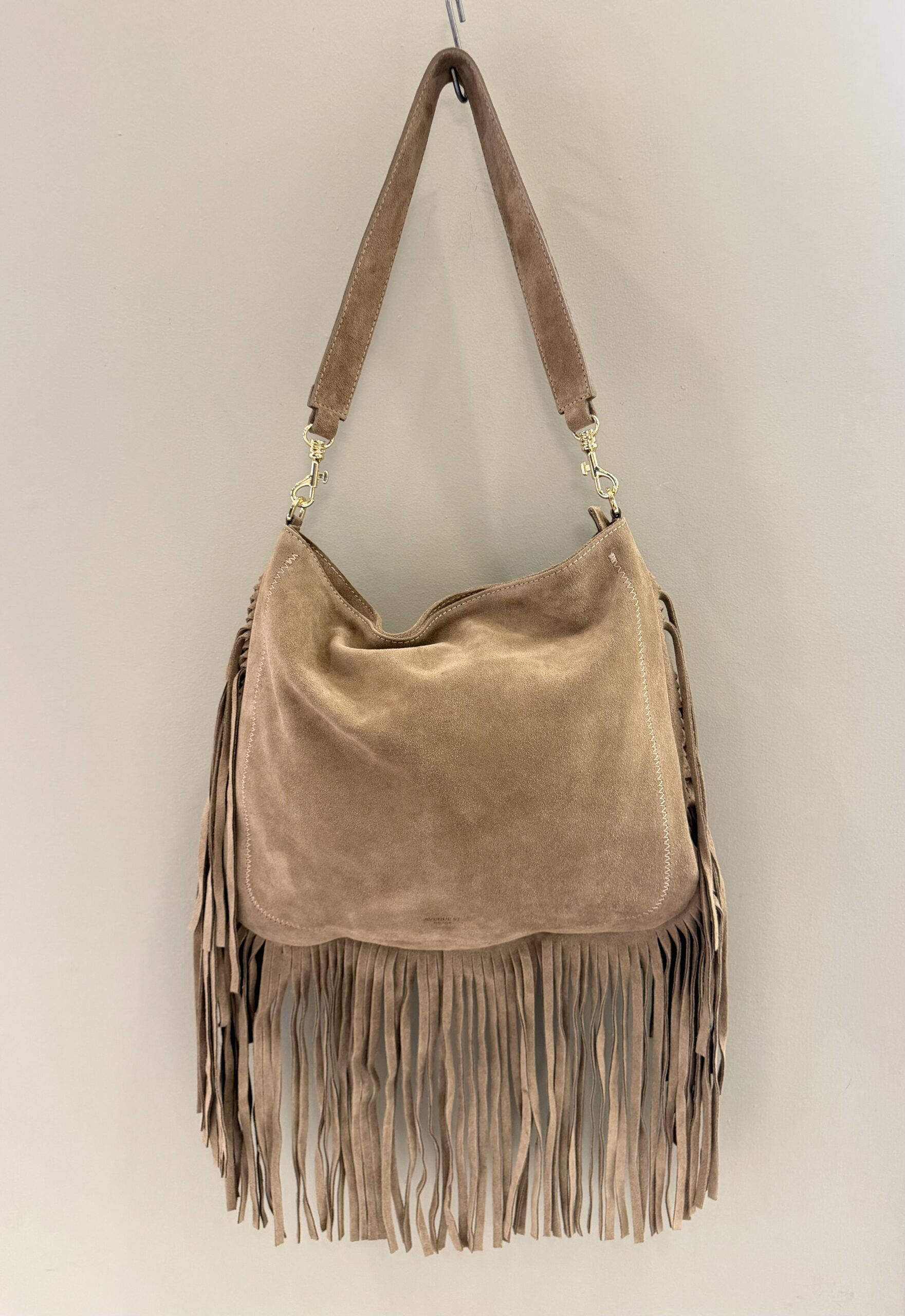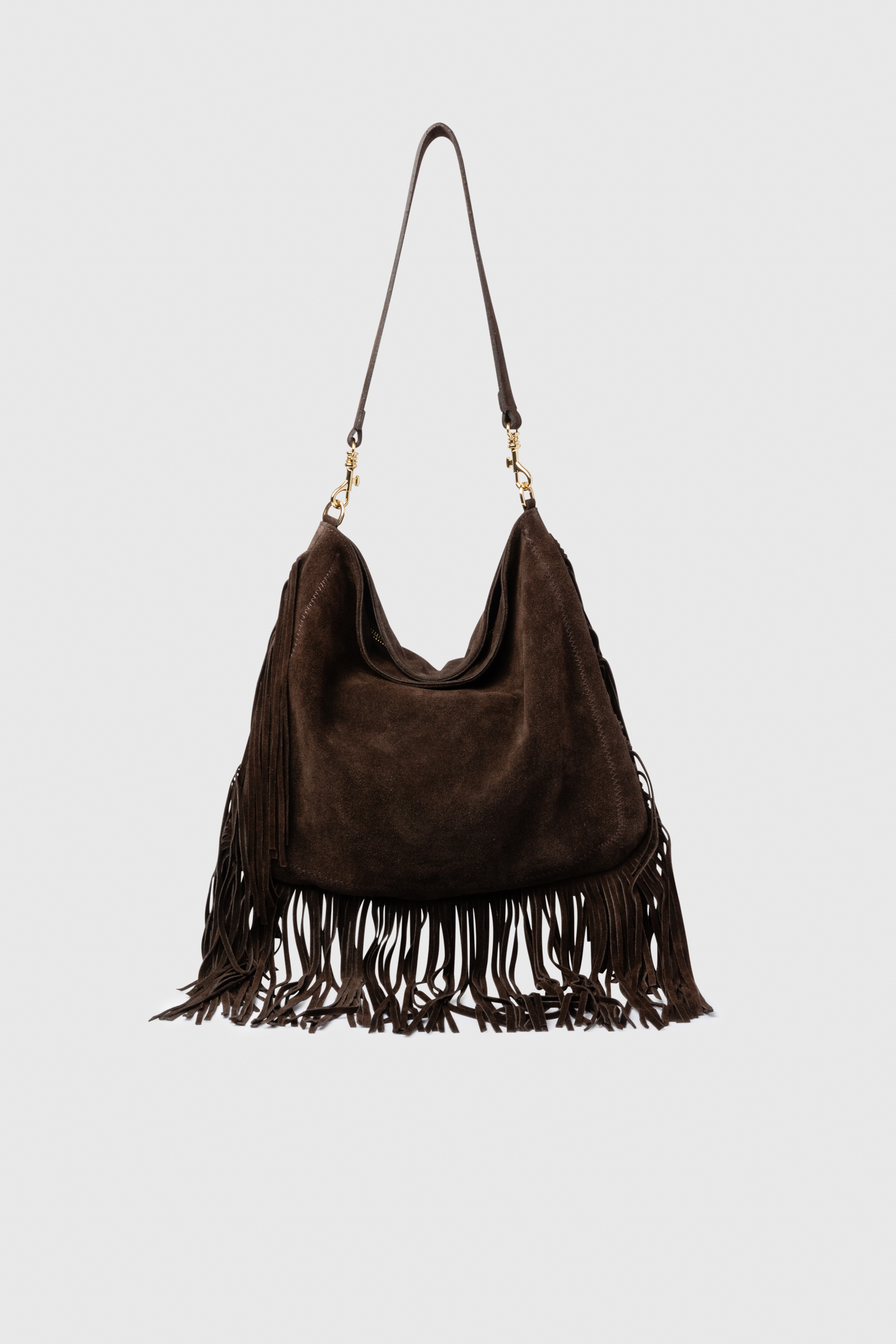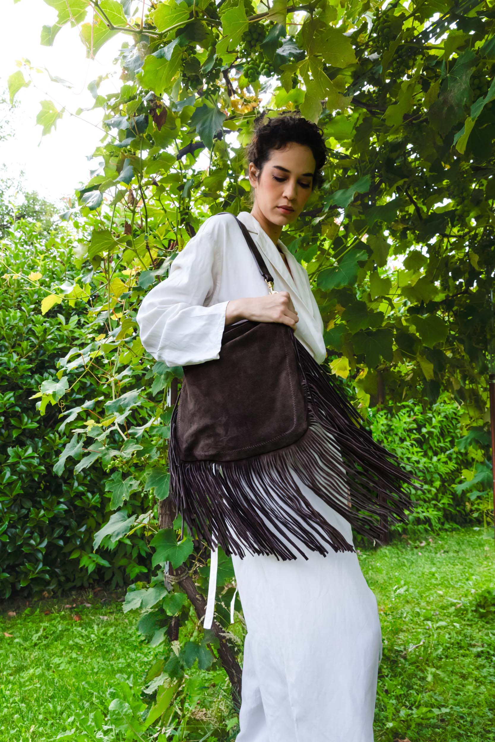 Sacca morbida con frangia, manico removibile, chiusura con zip, unico vano centrale, tasca interna con zip, doppia tasca portaoggetti, tracolla removibile e regolabile max cm.115.