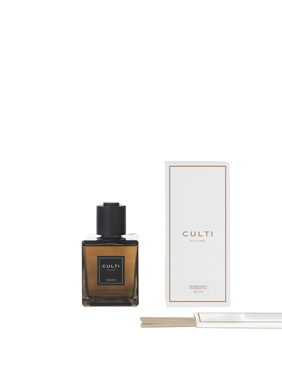 Flaconi scolpiti e squadrati in vetro spesso con tappo in acero verniciato in colore marrone scuro. I tratti netti e decisi della linea CULTI DECOR aggiungono un tocco di carattere agli ambienti. Tessuto: camminare a palmi spiegati in un campo di cotone, accarezzando i fiocchi soffici. Toccare la leggerezza delle trame di sete preziose e lini naturali sul lago di Como, chiudere gli occhi e annusare la loro fresca e accogliente carezza. Sentirsi a casa sempre.