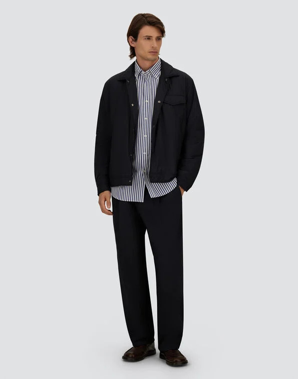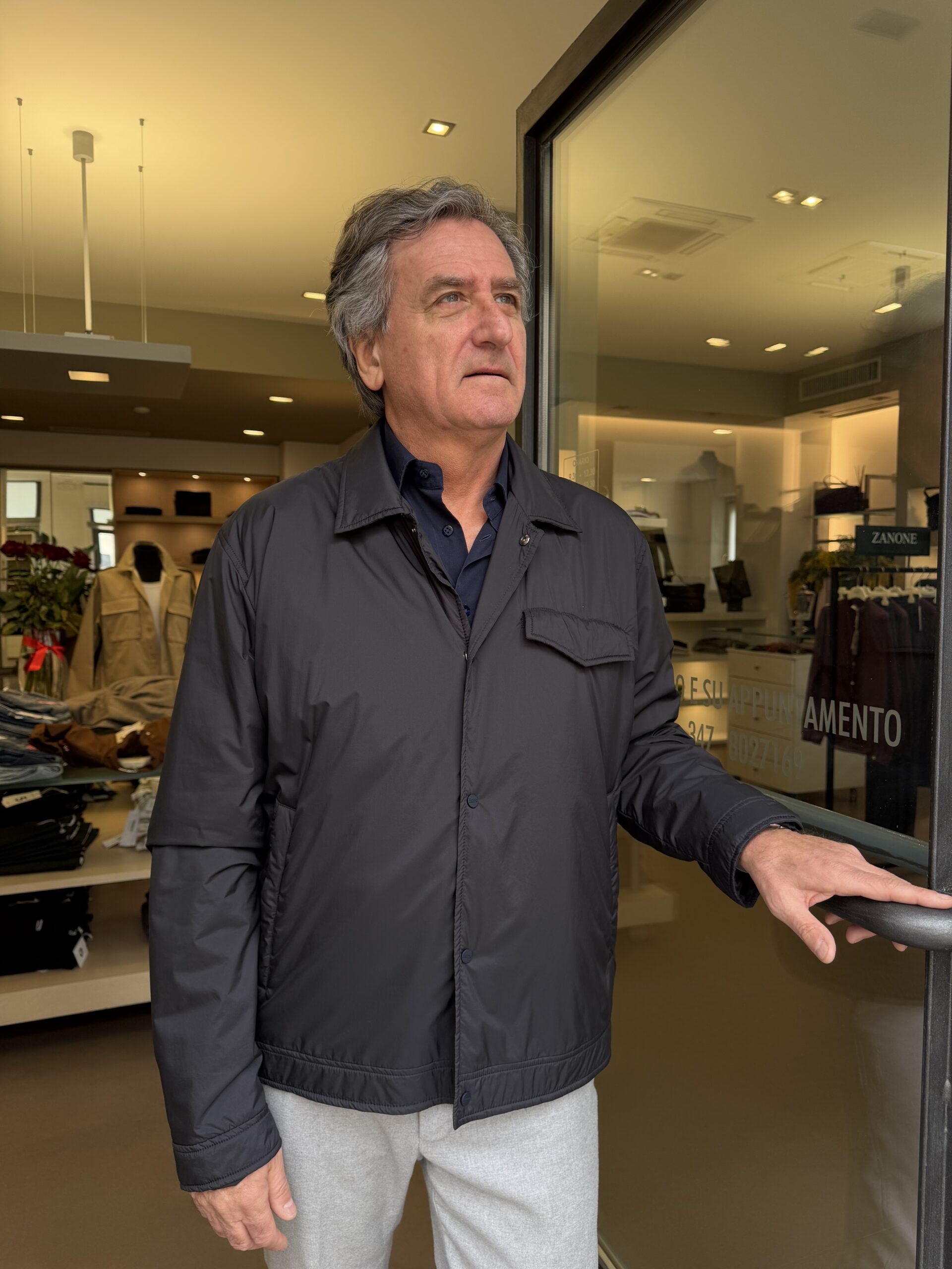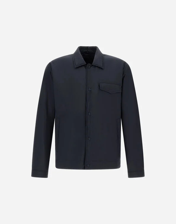 Shacket realizzata in microfibra di nylon riciclato con un leggero coating sul rovescio che rende la texture impermeabile, morbida al tatto e dall’aspetto opaco.