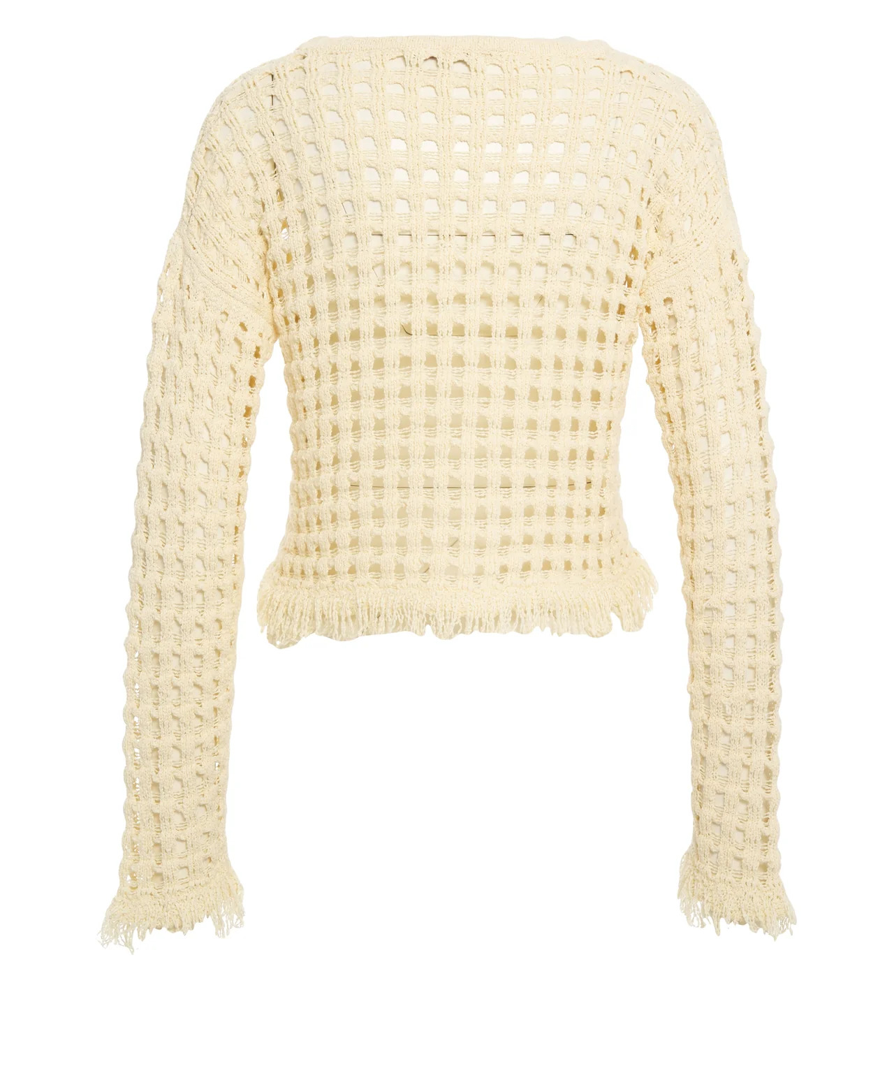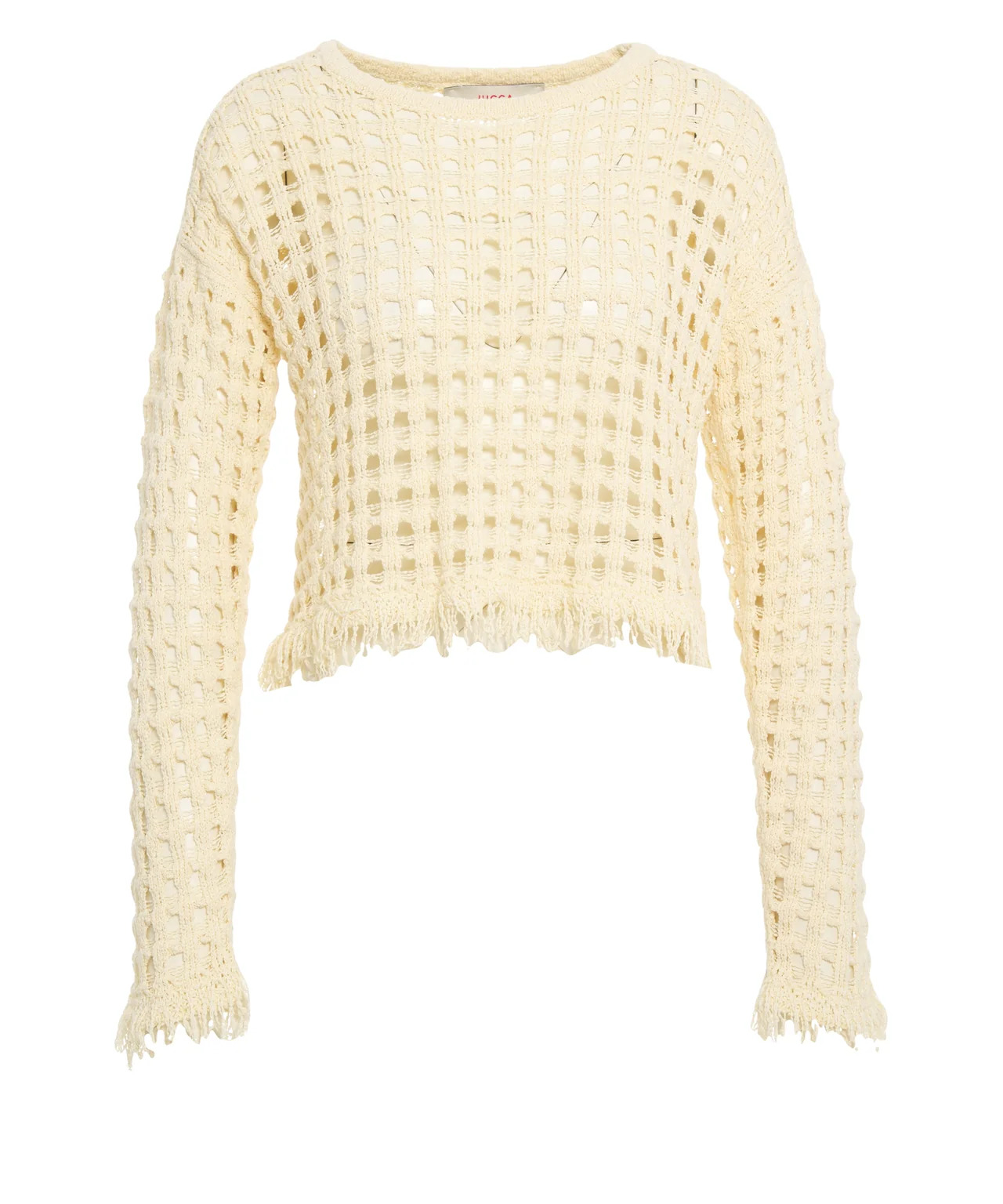 Questo elegante maglione di Jucca colpisce per la sua intricata struttura a rete in un pregiato misto cotone. Il modello dal taglio cropped è caratterizzato da distintivi dettagli con frange sull’orlo e sul fondo delle maniche, che conferiscono al design un tocco moderno. Un classico girocollo completa questo capo essenziale e traforato. Made in Italy.