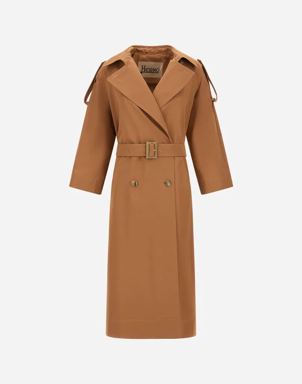 Trench in gabardina di poliestere e cotone intrecciati dall’aspetto tecnico e luminoso. Il tessuto è trattato con un finissaggio antigoccia che fa scivolare l’acqua.